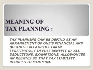 . Understand the objectives of tax planning in India and its various types along with their benefits and importance. Tax planning refers to financial planning for tax efficiency. Tax management is responsible for the timely filing of returns having accounts audited and.